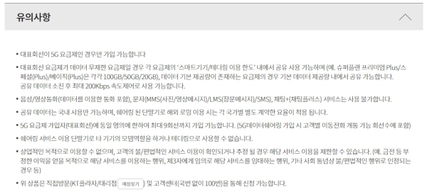 다만, 위 차트에 적혀있는 5G 요금제인 슈퍼플랜 프리미엄 Plus등과 같은 요금제는 제한적인 용량 안에서 데이터 쉐어링이 가능하다. 다만, 기존에 LTE로 KT 패밀리박스를 통해 가족 간에 데이터 쉐어링을 사용하다가 5G로 변경했다면 한 번은 꼭 확인해보는 것이 좋을 듯합니다.