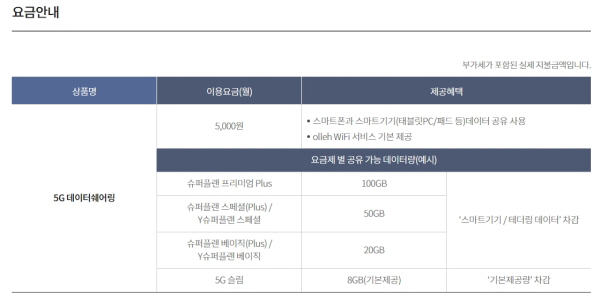 SK와 KT 5G 요금제는 데이터 쉐어링 추가요금이 발생한다. KT의 경우에는 5G 데이터 쉐어링 사용 요금이 월 5,000원 추가로 발생한다.