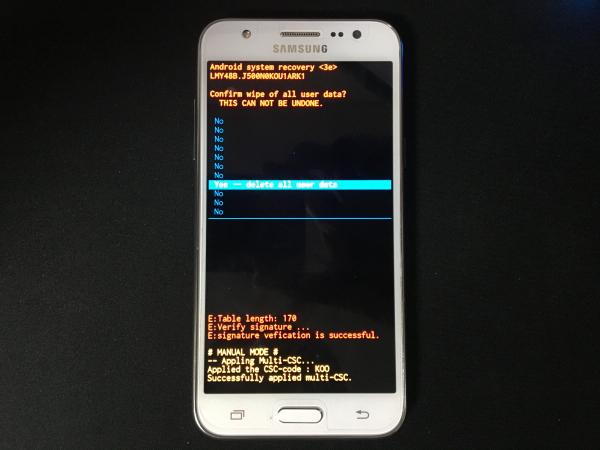 볼륨 버튼을 이용하여 8번째에 보이는 Yes를 선택한 후, 전원버튼을 눌러주세요. 전원 버튼을 누르는 순간 바로 안드로이드 공장초기화가 즉시 진행되기 때문에 백업해두어야할 것들이 있다면 확인 후 진행해주세요.