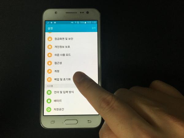 설정에서 화면을 조금 내리다보면 백업 및 초기화라는 탭이 보이는데요. 안드로이드 스마트폰마다 조금씩 명칭이 다를 수 있으나 초기화라고 적혀있다면 대부분 맞습니다. 백업 및 초기화를 탭해주세요.