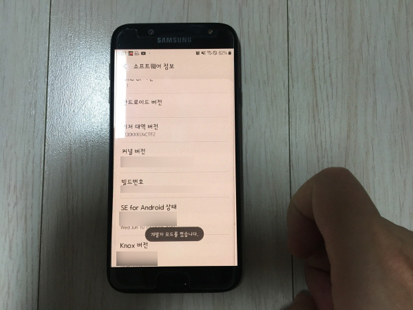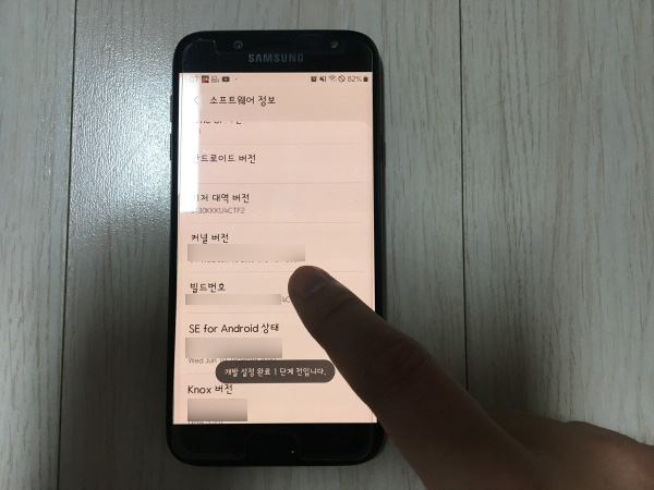 휴대전화 정보 메뉴에 진입해서 아래로 내려가다보면 빌드번호라는 탭이 보이는데요. 빌드번호탭을 여러번 눌러주세요. 여러 번 눌러주게 되면 "개발 설정 완료 X단계 전입니다."라는 멘트가 출력되는데 걱정하지 말고 계속 눌러주세요.