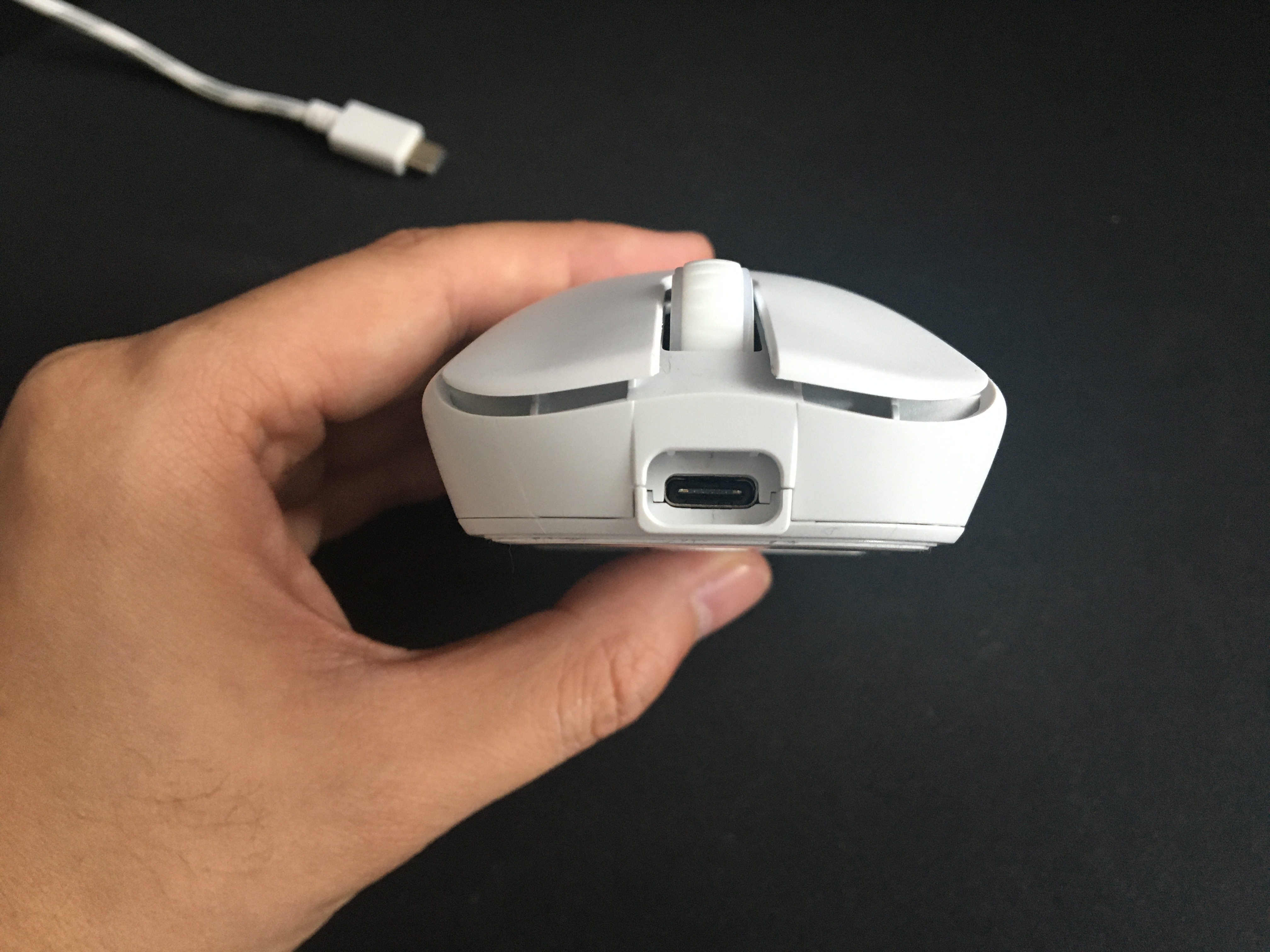 타이탄 GX AIR 무선 마우스는 유/무선으로 사용할 수 있는데요. 유선으로 사용할 때는 마우스 전면에 있는 홀에 유선 케이블을 장착해주면 됩니다. 충전도 같은 방법으로 가능합니다.