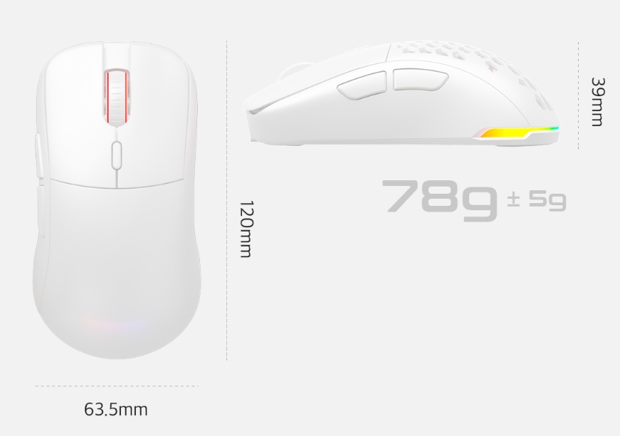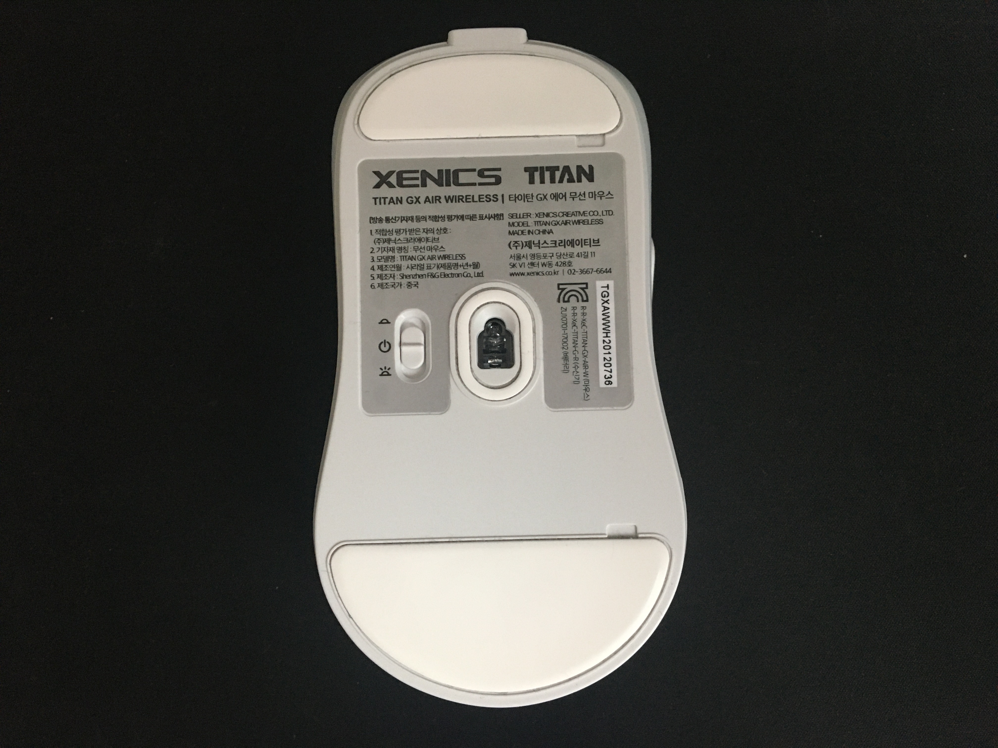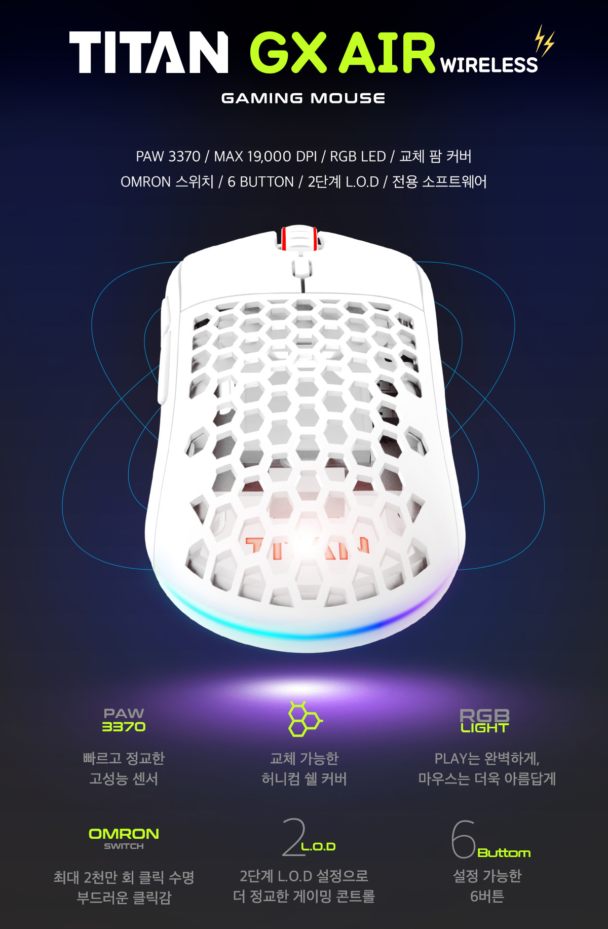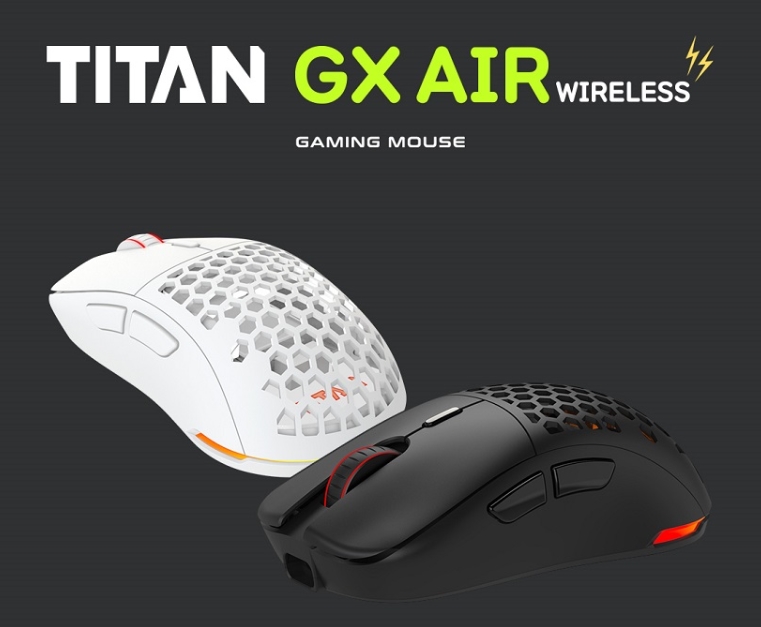 타이탄 GX AIR 무선은 제닉스의 게이밍 브랜드 타이탄의 무선 게이밍 마우스로 세로 120mm, 가로63.5mm, 높이 39mm의 사이즈와 함께 약 78g의 가벼운 무게, 그리고 PAW3370 센서를 탑재한 제품입니다.