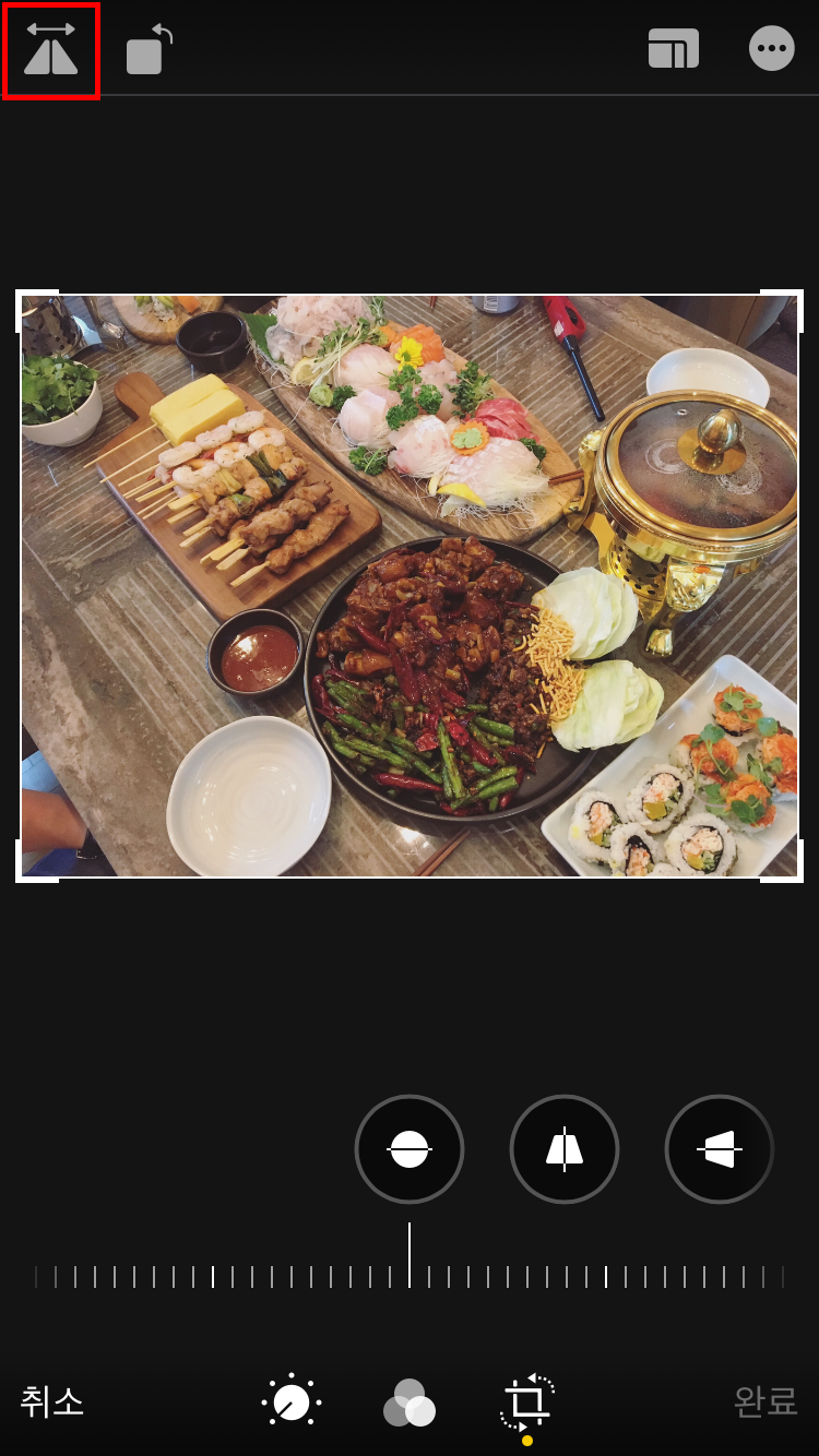 앞서 말한 "크롭"표시 모양을 터치하여 마지막 단계로 넘어왔다면 위 사진과 같이 빨간색 박스로 표시한 좌측 상단에 있는 "좌우반전" 아이콘을 터치해주세요.