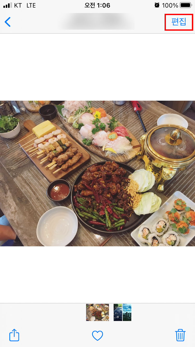 화면 우측 상단에 "편집"을 터치하면 사진을 편집할 수 있는 다음 단계로 넘어가게 되는데, 여기서 하단 맨 오른쪽에 보이는 빨간색 박스로 표시한 "크롭"표시 모양을 터치해주세요.