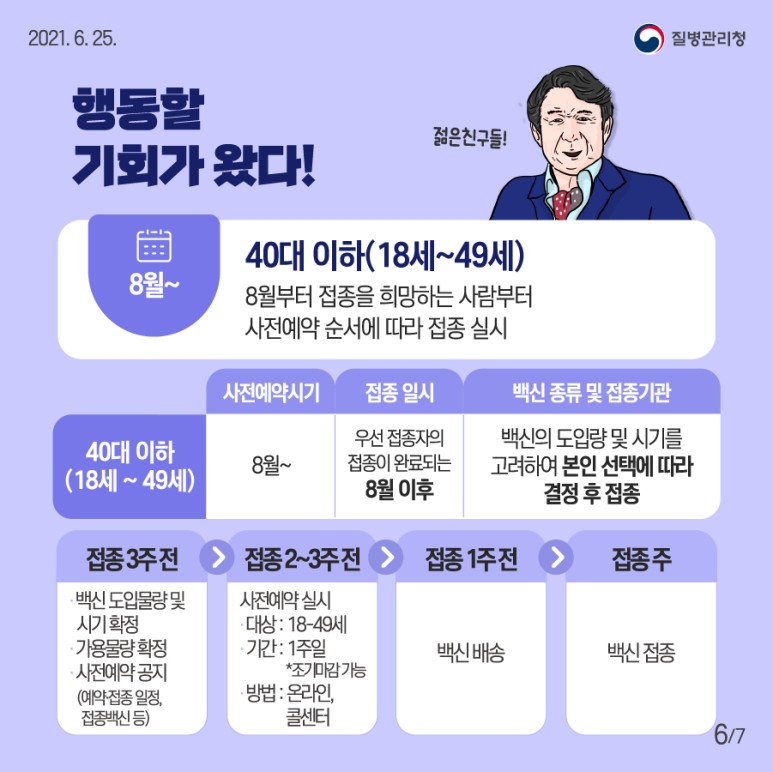 지난 6월 질병관리청에 따르면 40대 백신 접종 시기는 대략적으로 8월이 될 것으로 예상되었습니다. 위 배너사진과 같이 40대 이하, 18세부터 49세까지, 8월부터 접종을 희망하는 사람부터 사전예약 순서에 따라 접종을 실시한다라고 적혀있습니다.