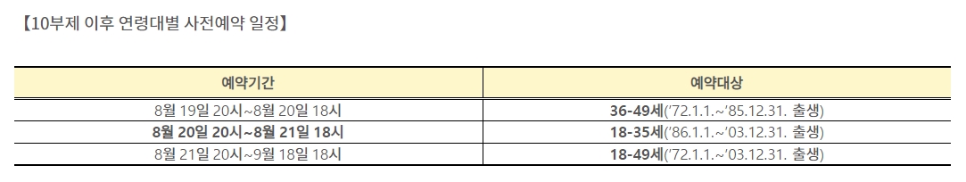백신 10부제 예약이 끝난 후에는 연령대별 사전예약 일정이 위 차트와 같이 추가로 진행된다고 합니다. 코로나 백신 10부제 기간에 해당 날짜에 예약하지 못하신 분들이라면 이 기간을 추가로 노려보시는 것이 좋을 것 같습니다.