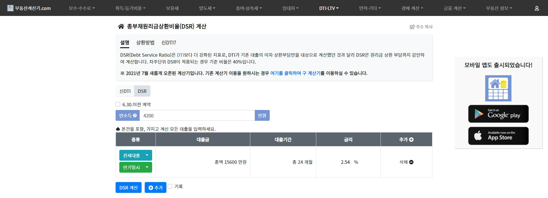 행 추가 등은 위 사진에 보이는 빨간 박스에 +추가 버튼을 클릭하여 새로운 행을 생성하여 기입해주시면 됩니다. 모든 기입이 완료되면 DSR 계산을 클릭해줍니다.