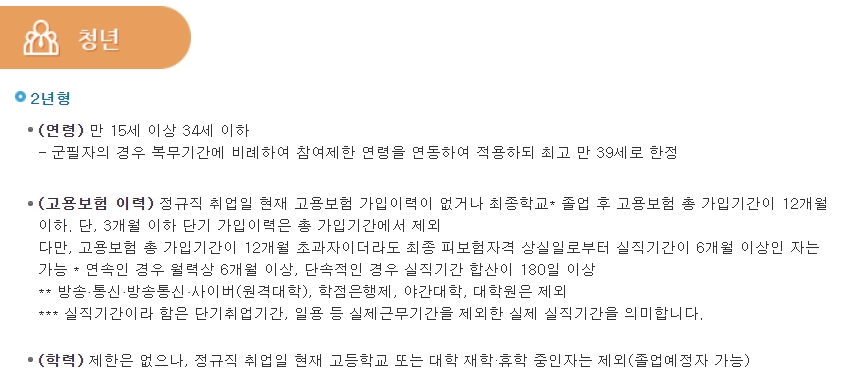 - 고용보험 이력은 정규직 취업일 현재 고용보험 가입이력이 없거나 최종학교 졸업 후 고용보험 총 가입기간이 12개월 이하인 경우 가능합니다. 단, 3개월 이하 단기 가입이력은 총 가입기간에서 제외합니다. 다만, 고용보험 총 가입기간이 12개월 초과자이더라도 최종 피보험자격 상실일로부터 실직기간이 6개월 이상인 자는 가능 (연속인 경우 월력상 6개월 이상, 단속적인 경우 실직기간 합산이 180일 이상)