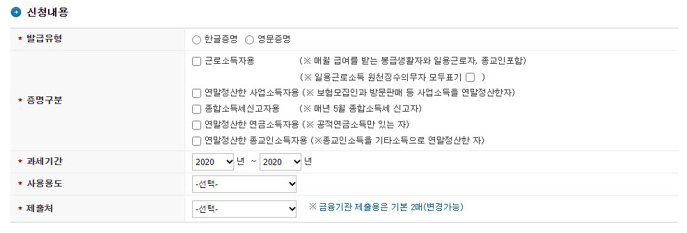 로그인을 마쳤다면 신청내용을 읽어보고 나에게 적합한 증명 구분을 선택해주셔야 합니다. 예를 들자면, 나는 월급받는 근로자인데 연말정산한 사업소득자용을 선택하면 자료가 없어서 아무것도 나오지 않고 발급이 불가능합니다.