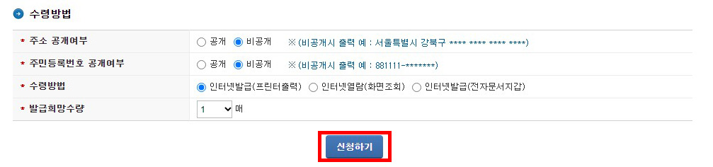 그리고 수령방법에 나온 주소, 주민등록번호, 수령방법, 희망수량 등을 나에게 맞게 선택해주신 후에 아래 보이는 '신청하기'를 클릭해주세요.