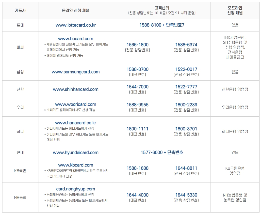마지막으로 9개 전담카드사 별 신청 채널 정보를 참고하여 신청하시길 바랍니다.