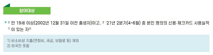 참여 대상자는 만 19세 이상이라면 누구나 참여가 가능합니다만, 21년도 2분기(4~6월) 중 본인 명의의 신용 또는 체크카드 사용실적이 있어야 한다고 하니 참고하세요.