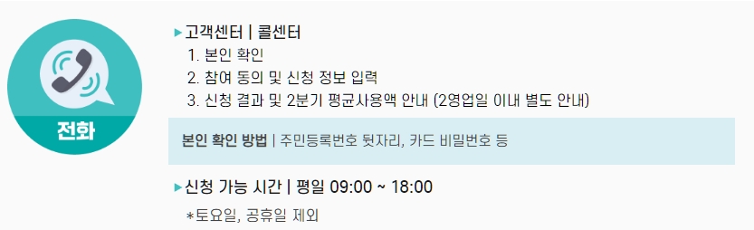 온라인채널로 신청이 어려운 분들이라면 고객센터 콜센터에 연락하여 신청하는 방법을 추천 드립니다. 진행방법은 온라인채널과 비슷하나 콜센터를 통해 상담원과 진행하기 때문에 어렵지 않겠죠? 접수 전에 주민등록번호 뒷자리, 카드 비밀번호는 꼭 준비해주세요.