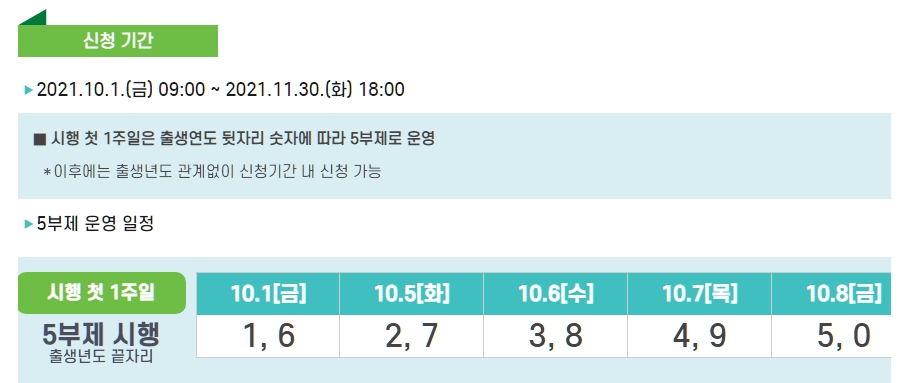 정부 상생소비지원금 신청기간은 앞서 안내드린 것처럼 돌아오는 2021년 10월 1일 9시부터 2021년 11월 30일 18시까지입니다. 다만, 시행 첫 일주일은 서버 과부하 및 혼잡을 완화하기 위해 5부제를 시행한다고 하는데요. 출생년도 끝자리에 따라 요일별로 참여신청할 수 있는 날이 다르니 꼭 확인하시기 바랍니다.