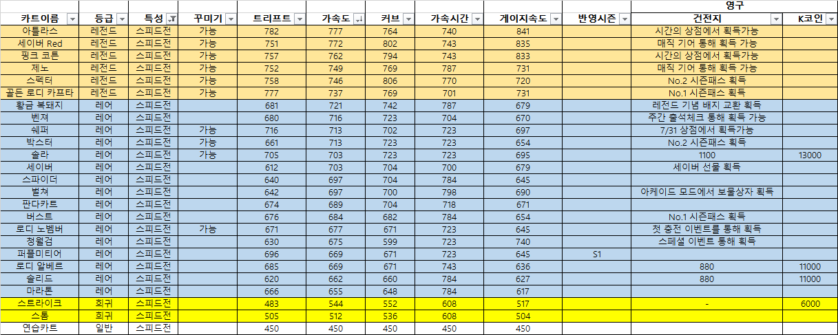 재미삼아 하는 내맘대로 쭈~욱 진행해보는 것도 좋지만, 힘들게 모은 K코인과 에너지 크리스탈을 써버리고 다시 모으려면 너~무 힘드니깐 카트라이더 카트 순위정도는 알아보고 가는게 좋겠죠?