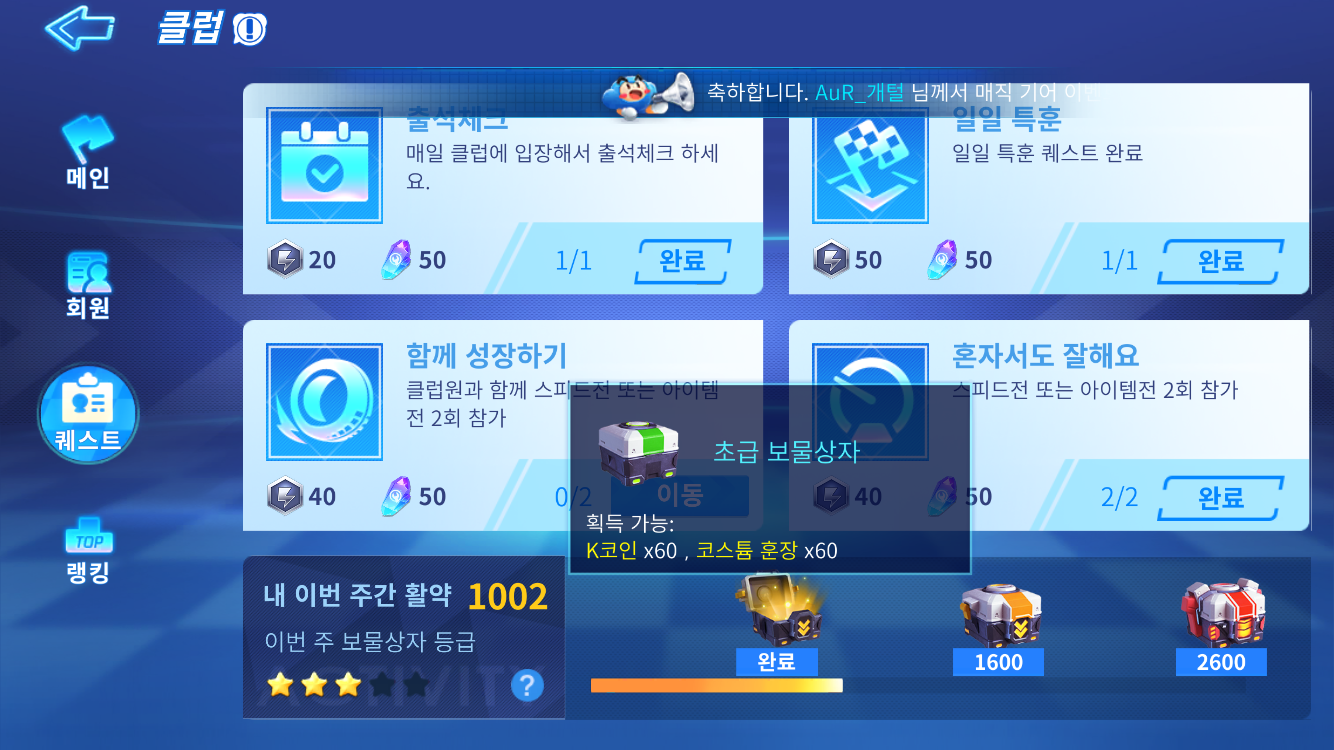 가장 처음으로 접할 수 있는 모바일 카트라이더 러쉬플러스 k코인을 얻을 수 있는 방법은 "일일퀘스트"입니다. No.2 시즌이 시작한 7월 29일 기준으로 k코인 580개를 획득할 수 있어요.