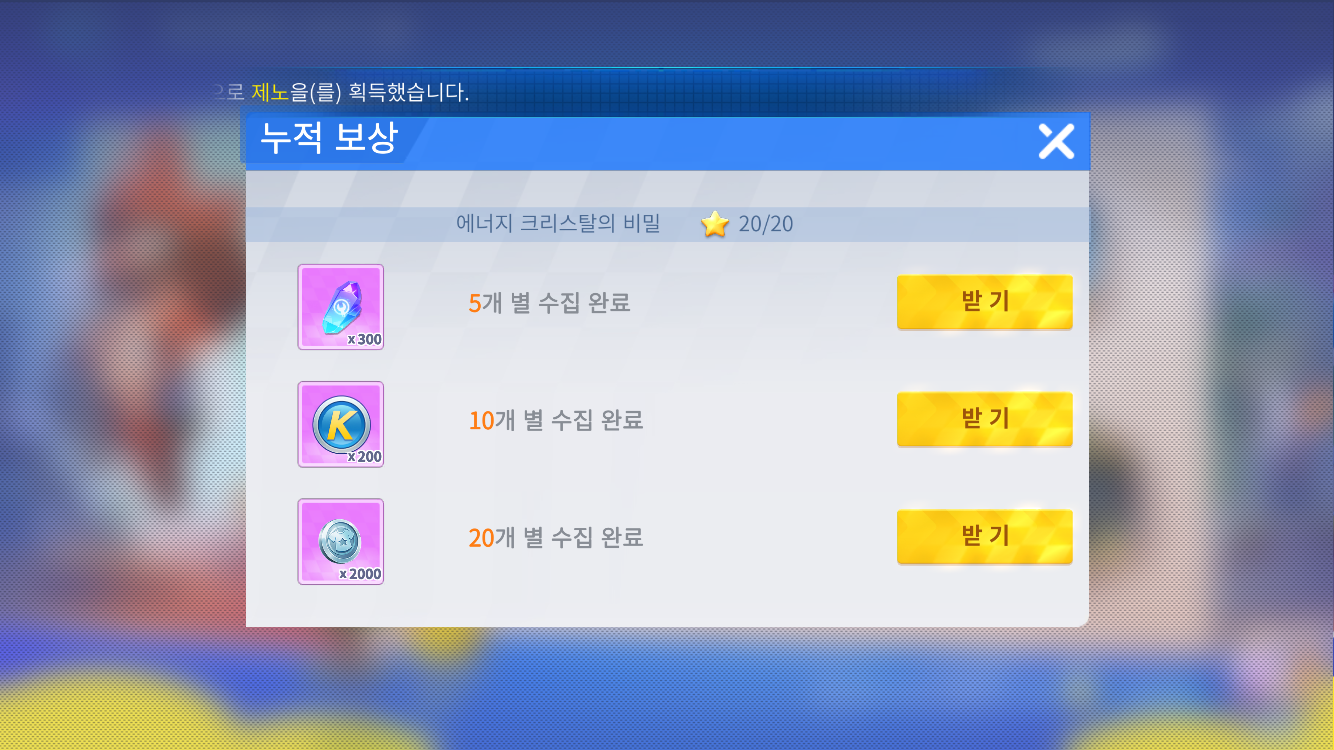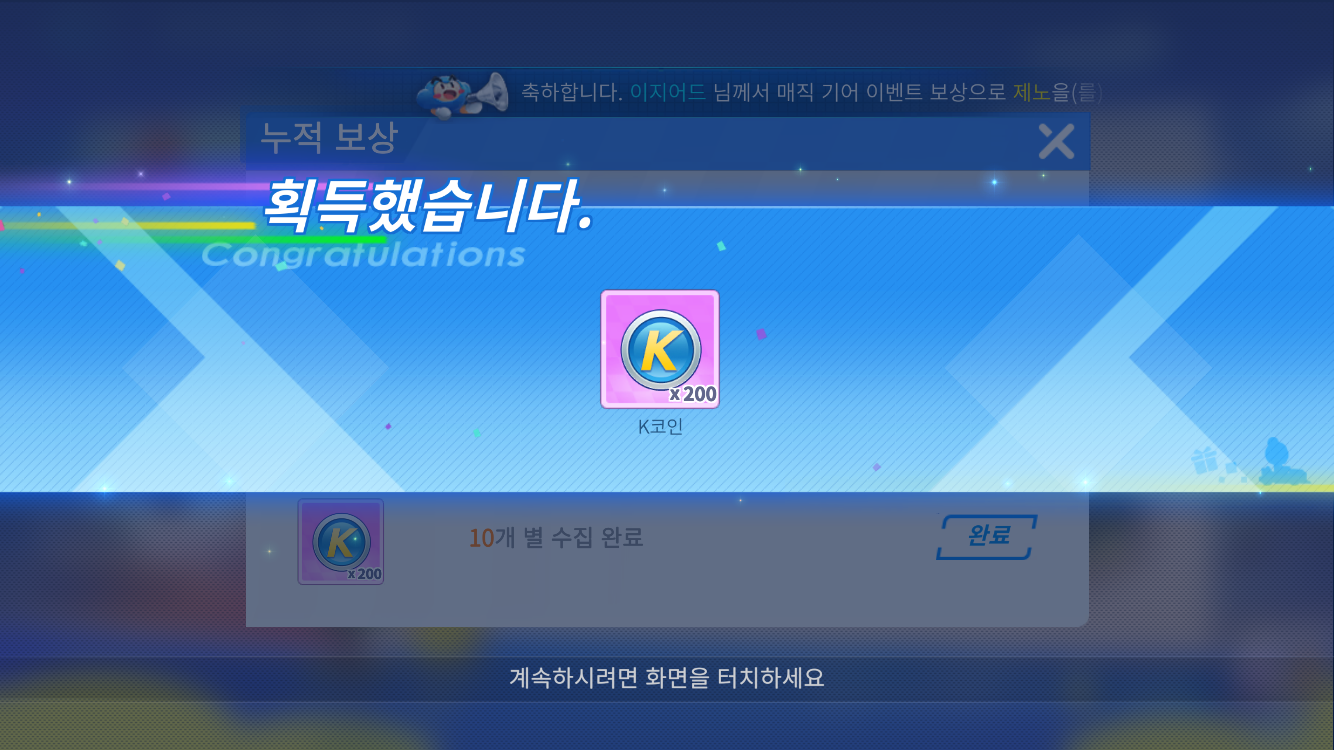 시나리오 모드 1챕터를 클리어하게되면 오른쪽 하단에 보상이라고 적혀있는 부분을 탭하게되면 모바일 카트라이더 러쉬플러스 K코인 200개를 수급할 수 있습니다.