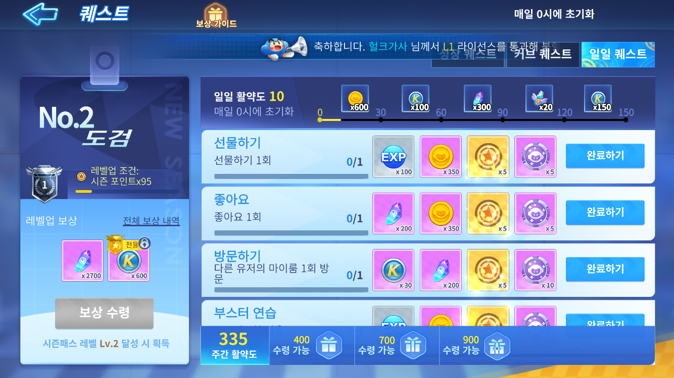 각 단계마다 별 획득 조건들이 있고, 별들을 합산해서 보상을 받을 수 있습니다. K코인 총 250개를 얻을 수 있으며, 매주 금요일마다 퀘스트가 갱신되니깐 목요일까지는 완료해야겠죠?