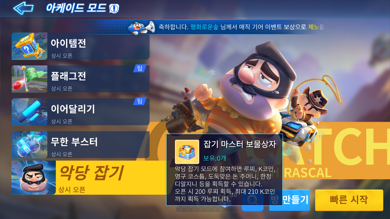 잡기 마스터 보물상자: 루찌, K코인, 영구 코스튬, 도둑맞은 돈 주머니, 한정 디알지니등 획득 가능 - 오픈 시 200루찌 획득 (K코인 최대 210개 획득 가능)