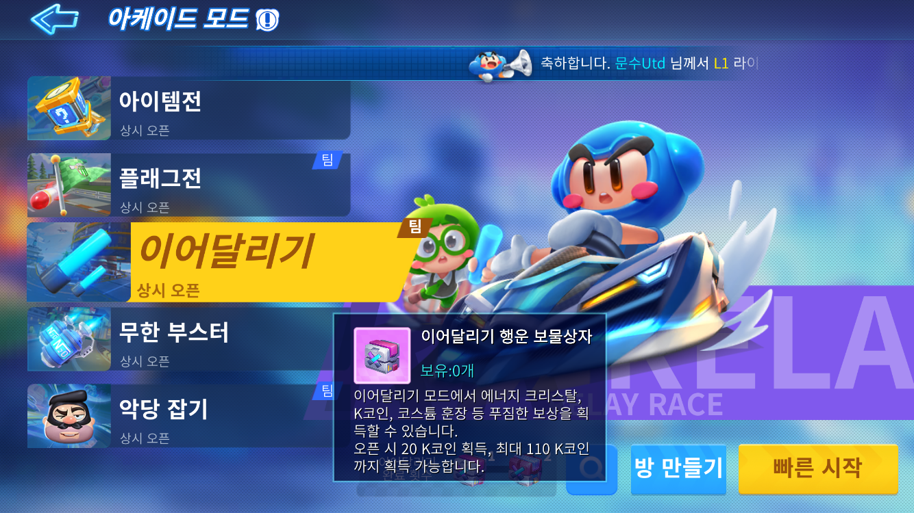 확정이 아니라 아쉽긴 하지만 나름 필요한 루찌 획득하고 추가로 카트라이더 러쉬플러스 K코인을 노려볼 수 있는 아케이드 전이네요. 오래 걸리지 않으니 부수입으로 한다 생각하고 해야겠어요.