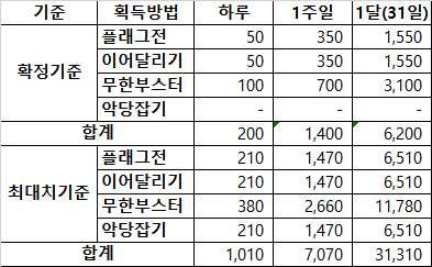 우리가 필요한 카트라이더 K코인은 하루에 최소 100개(확정), 최대 380개까지 가능하고 일주일이면 700개, 한 달(31일기준)이면 3100개입니다.