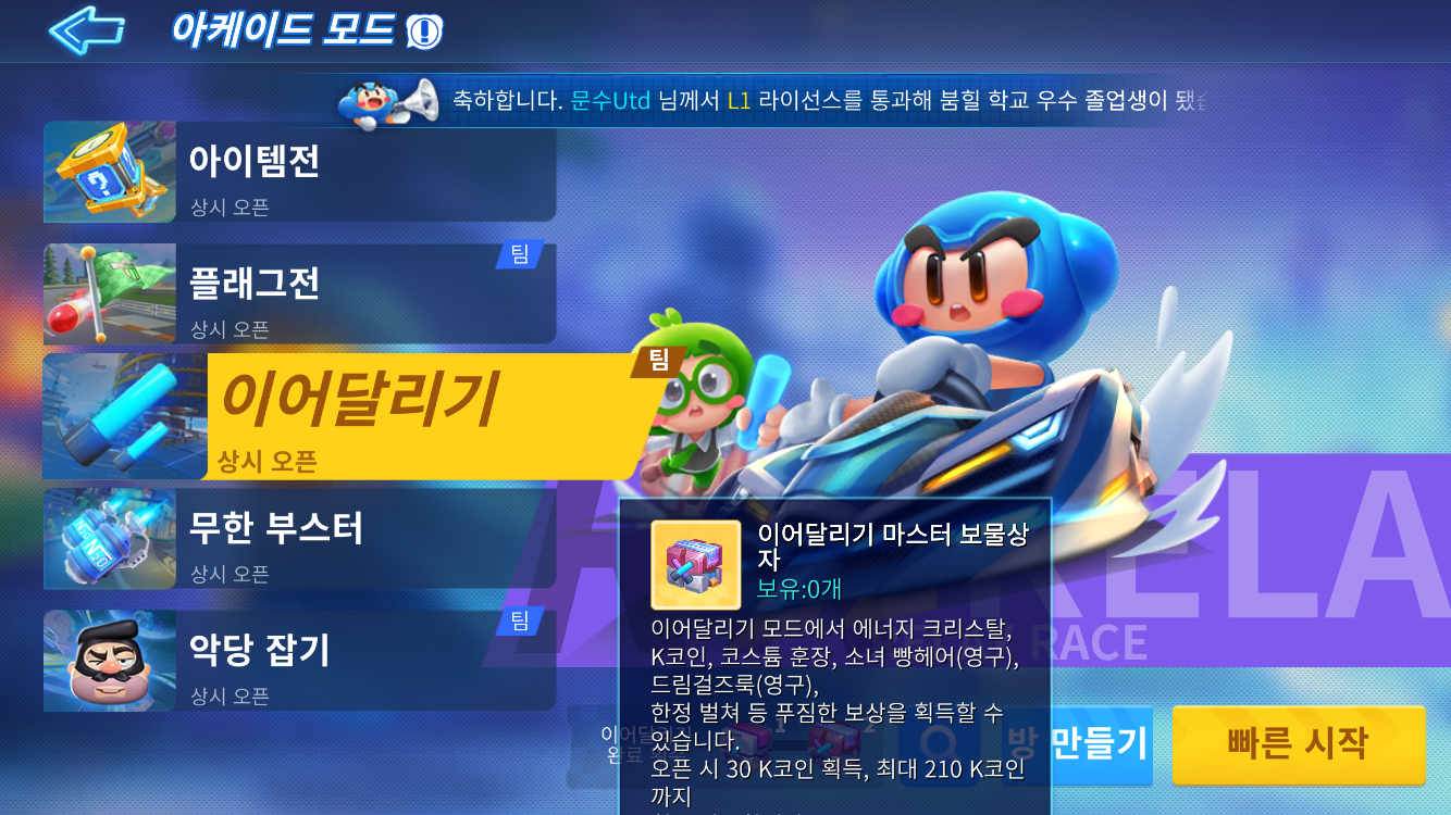 무한 부스터에서는 최대 3개의 보물상자를 획득할 수 있습니다. 말 그대로 살짝만 드리프트해도 부스터가 만들어져서 부스터를 무한히 사용할 수 있는 아케이드전입니다.