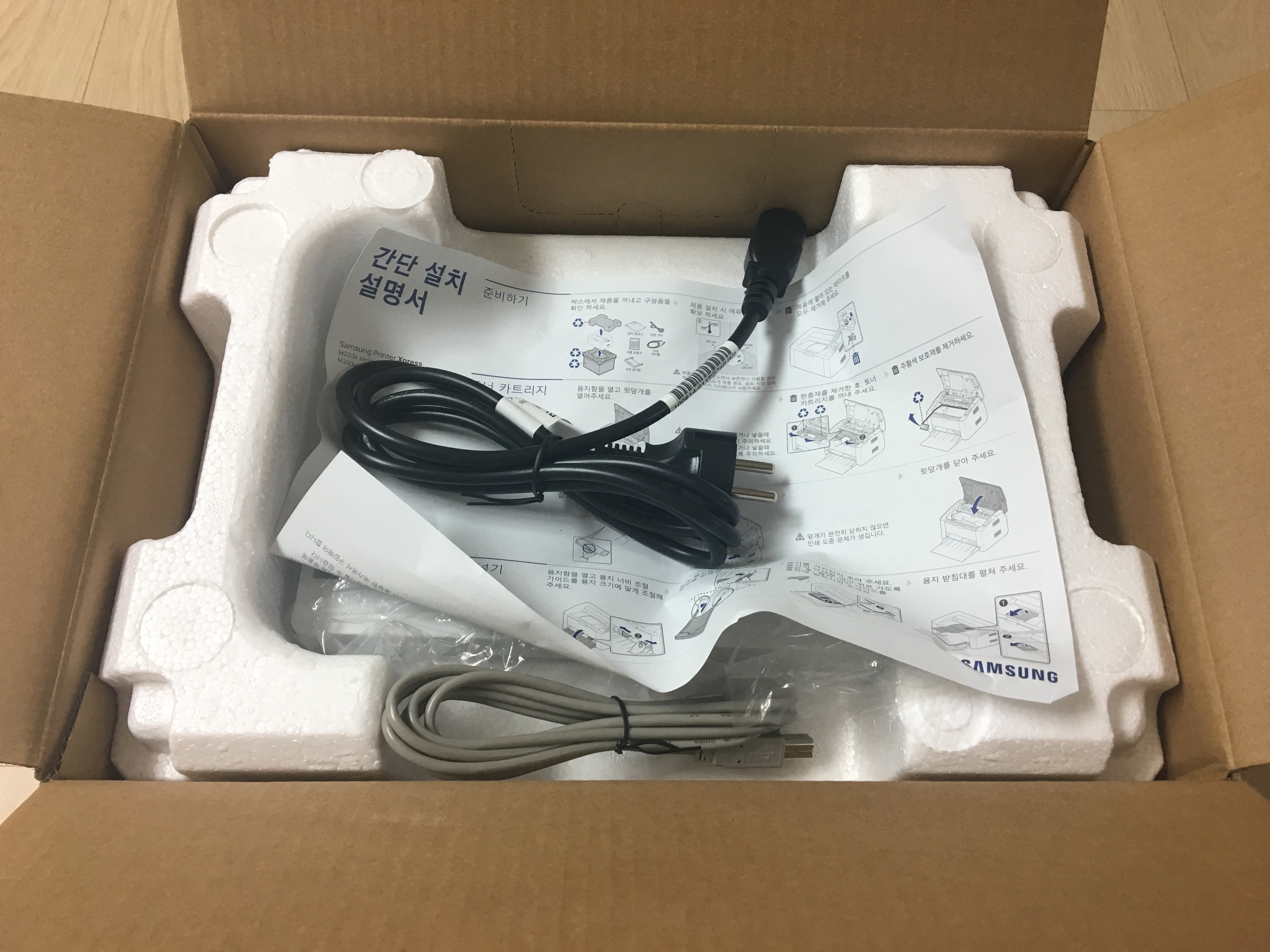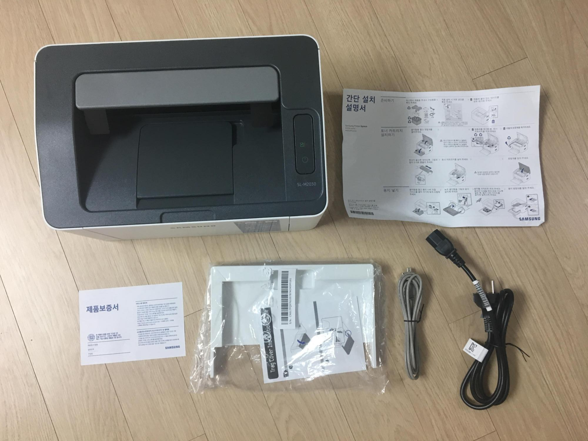 구성품은 단촐하게 삼성전자 흑백 레이저 프린터 SL-M2030(+기본토너), 각종 케이블과 보증서, 매뉴얼로 구성되어 있었습니다.