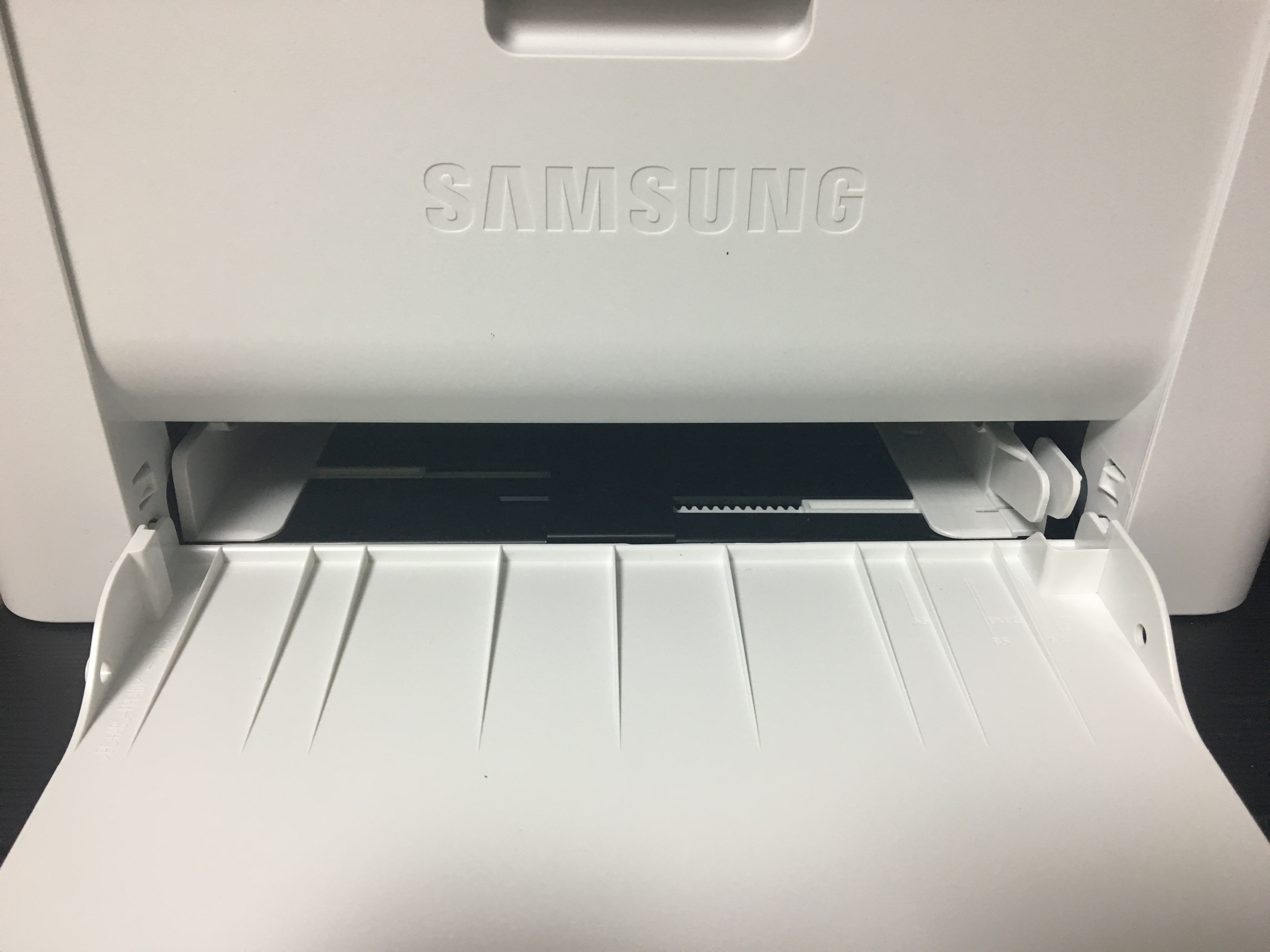 레이저 프린터 용지 투입구에는 사이즈를 조절할 수 있는 레버가 있고 수동으로 필요한 사이즈에 맞춰 조절해주시면 됩니다.